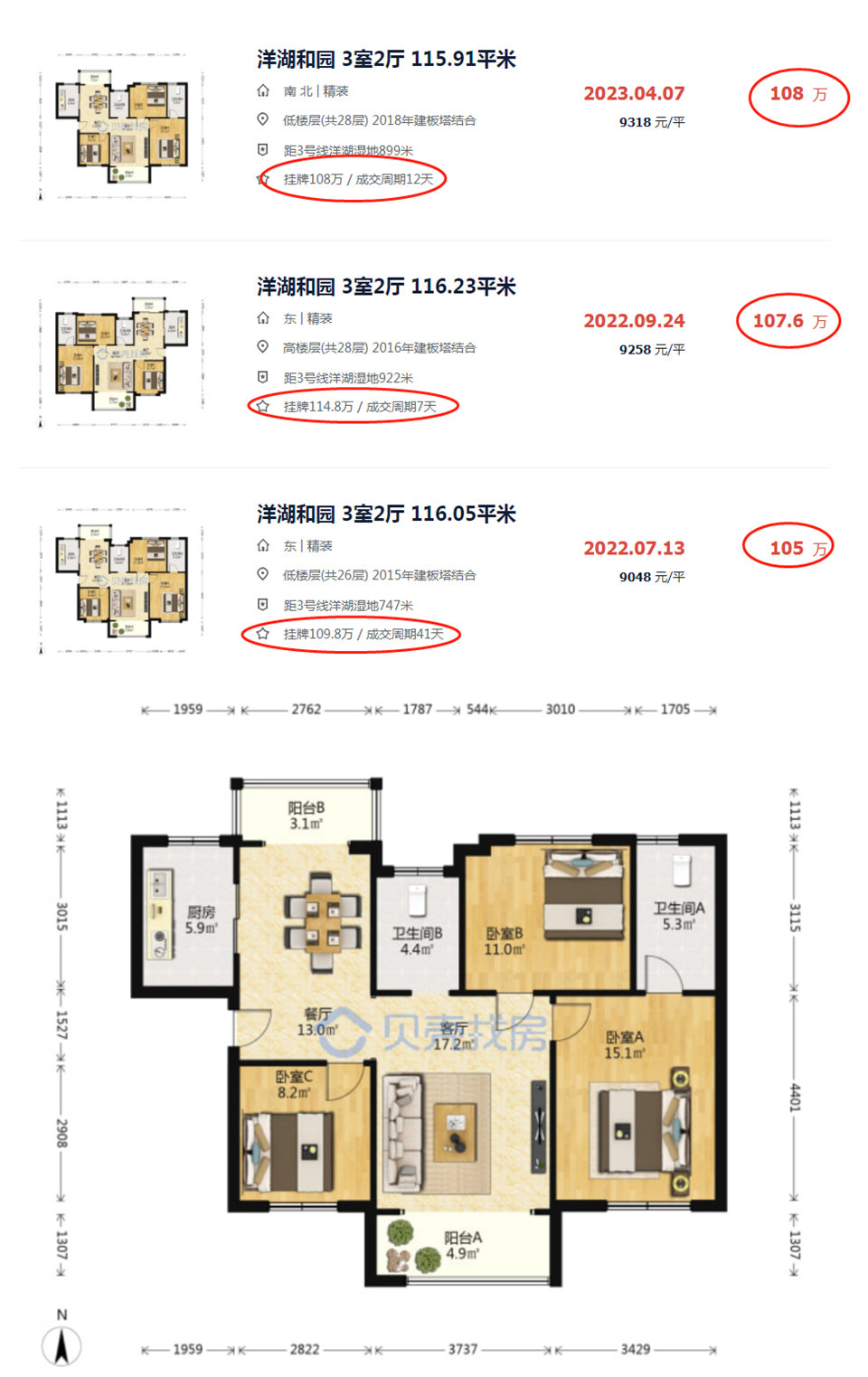 貝殼二手房同戶型成交價(jià)在108萬(wàn)左右(請(qǐng)注意看成交周期,都很快,掛出來十幾天就成交了),妥妥的撿漏四十萬(wàn)。