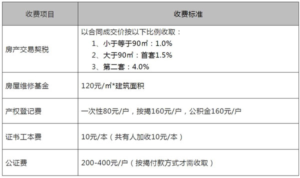 新房方面,交易稅費比較簡單,主要是契稅和房屋維修基金。收費項目一般都會在售樓部公示,可以套用下面的表格,核算應繳稅費。